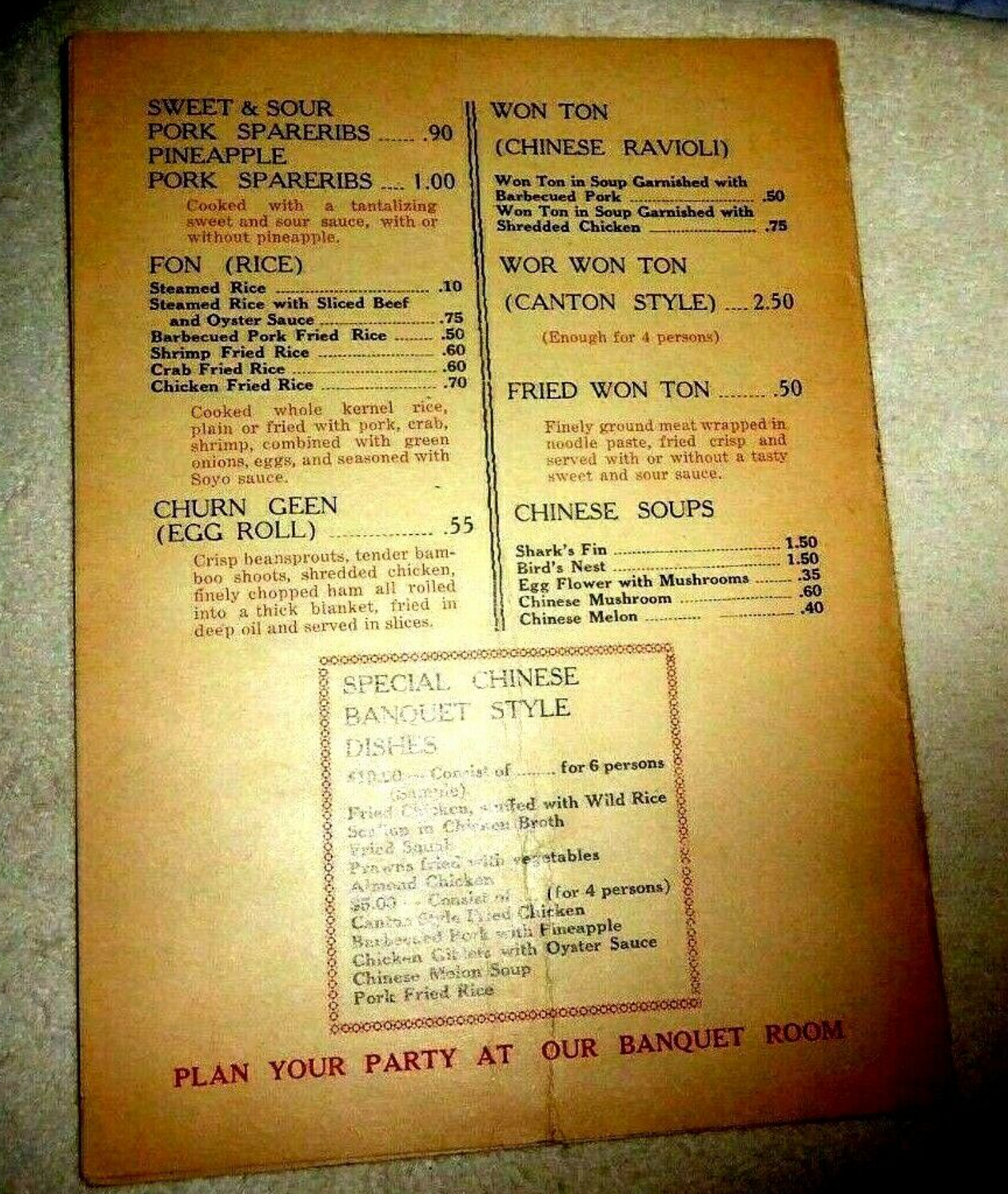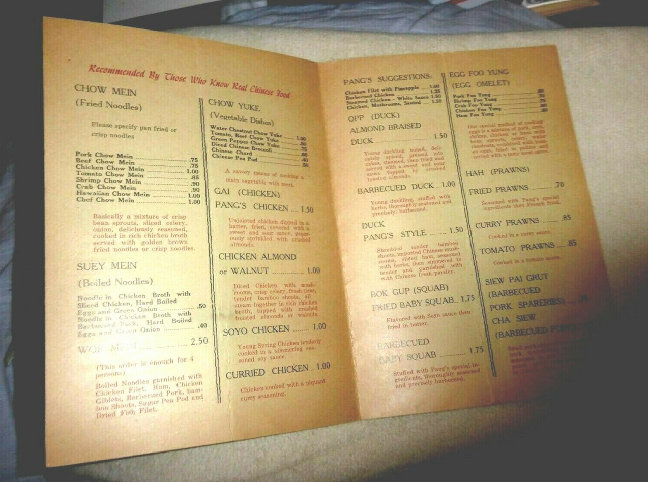 In the years since I have thought of the Pang’s many times. The building where Pang’s Kitchen was is still there, but there are no traces of the restaurant. I don’t know when the restaurant actually closed. I have searched for the name of the restaurant many times on the Internet, and, only recently did the above menu turn up on ebay.