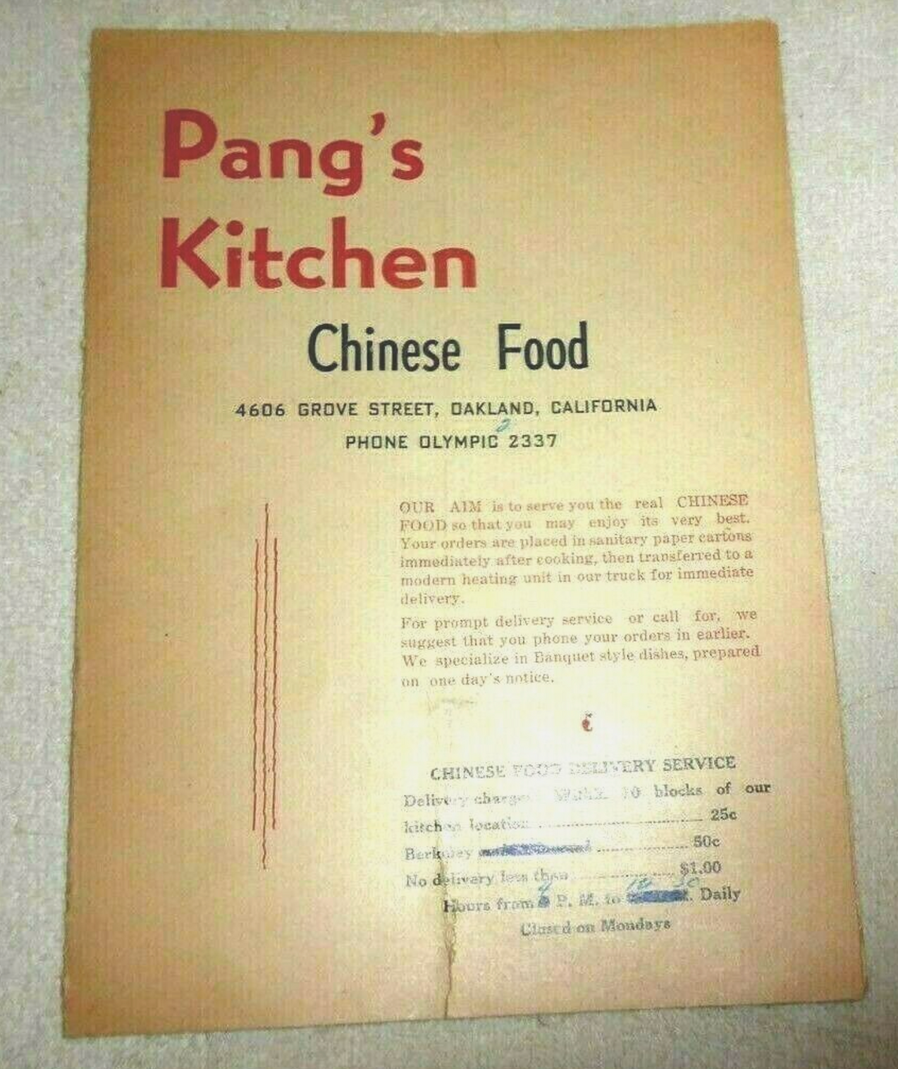People in the 1950s didn’t eat out very much. Fast food, aside from hotdog stands, just didn’t exist. However, my parents were devoted customers of a local Chinese restaurant called Pang’s Kitchen. It was on Grove St., now Martin Luther King Way, not too far from our house.