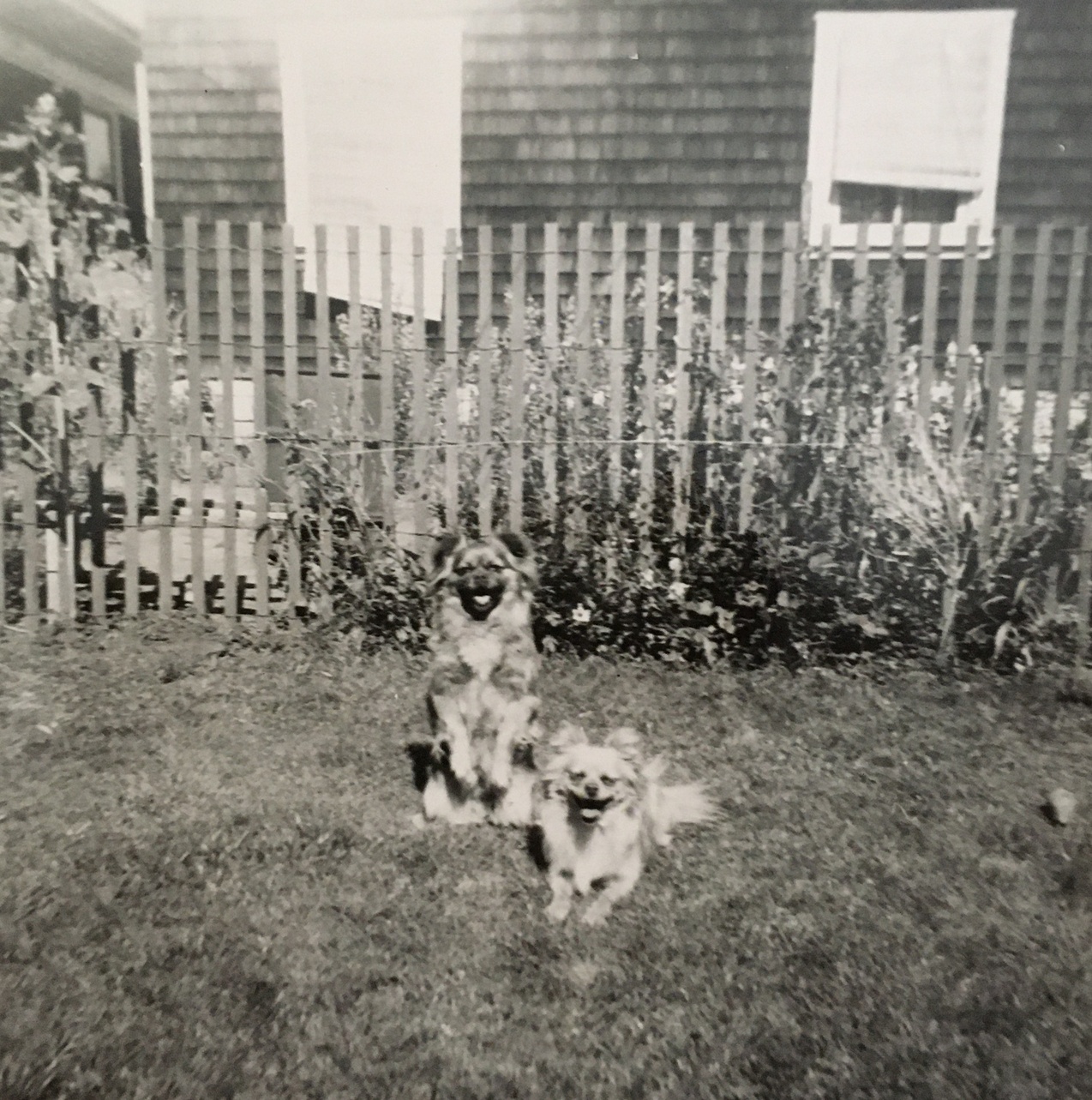 I was very close to Panda, but I never regarded her as “my” dog. My father walked her and fed her. My mother groomed and bathed her. She lived inside the house, unlike most other dogs in the neighborhood who lived in dog houses in the back yards. She was a very sweet and mild mannered dog. My father taught her to sit up and lay down and roll over. Panda had puppies a couple of times, probably in cooperation with the Pangs and their connections selling puppies. In the first litter my sister and her husband kept one of the puppies who they named Tiny. The photo above shows Panda (sitting up) and her daughter Tiny in our back yard on Vicente Street.