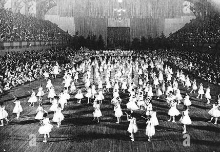 The Oakland Auditorium is a large space, and the audience for this event sat in the balconies. Thus they looked down on the dancing and the patterns it created. There was no stage involved.