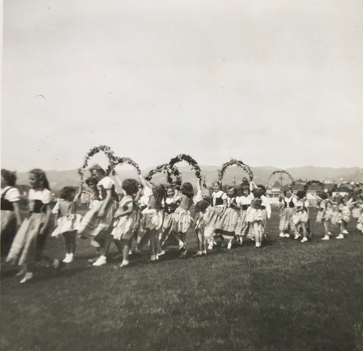 I can’t imagine the logistics involved in all this: the costuming, the rehearsing, the hundreds of children. The years when I participated I was always a (Christmas) fairy and my costume was white. The older you got, the more complicated your routine(s). The music was always Tchaikovsky’s Nutcracker Suite, and the most impressive dance was the Russian Dance, done by Miss Jorgensen’s star teen pupils from her dance studio. Of course I aspired to that dance corps, but, early on, my mother made it clear that I could not take dance lessons at Miss Jorgensen’s studio. Why it was okay for me to appear in an enormous, public dance performance but not take dancing lessons was a mystery to me until I finally came to understand that it was because the lessons cost money. Nonetheless, I enjoyed my years of International Pageants, May Day Festivals and Christmas Pageants, and I think this participation established, for me, a belief in the value of community activities and organizations like the Oakland Recreation Department.